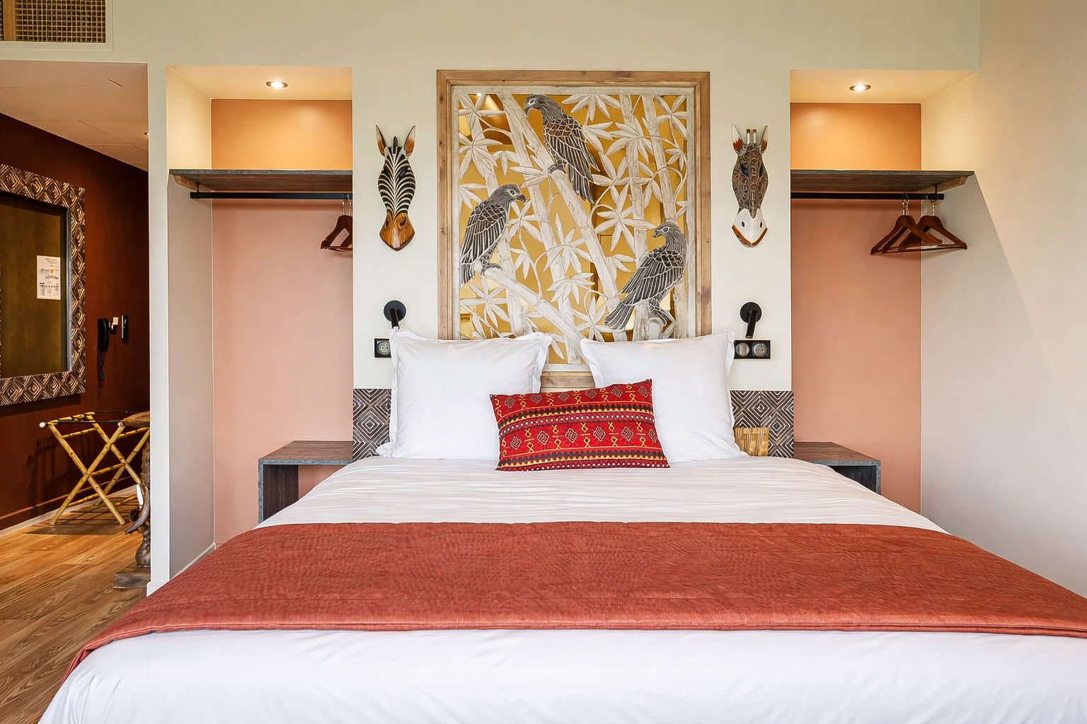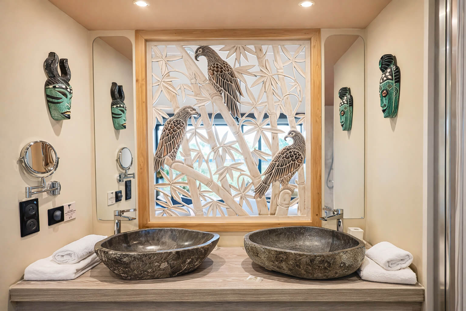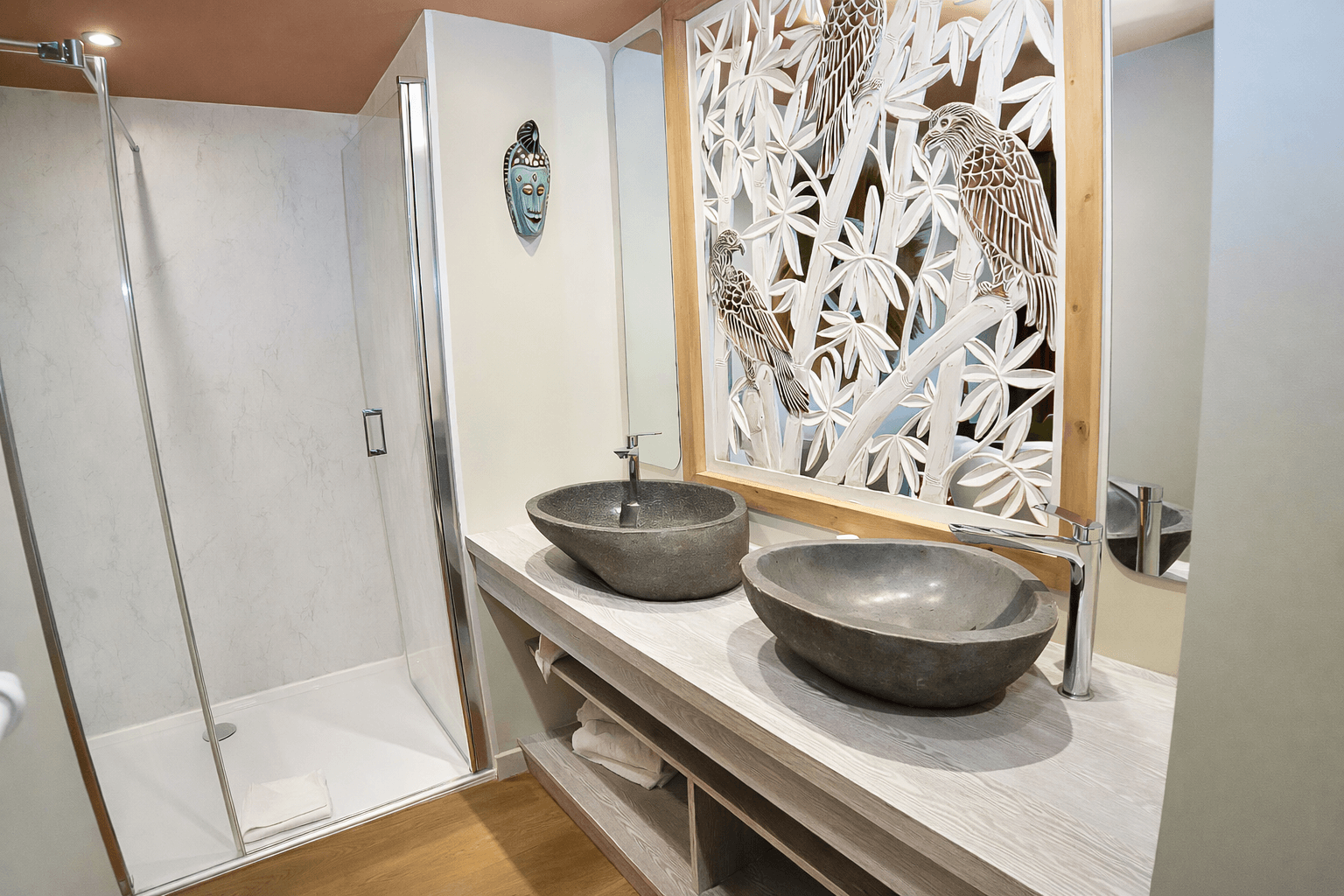 La chambre a été pensée pour les séjours à deux. Le lit king size invite à la détente, tandis que les volumes et la décoration créent une atmosphère à la fois chaleureuse et soignée. La salle de bain spacieuse, équipée d’une double vasque et sublimée par une plaque en bois sculpté, prolonge cette sensation de confort et de qualité.
