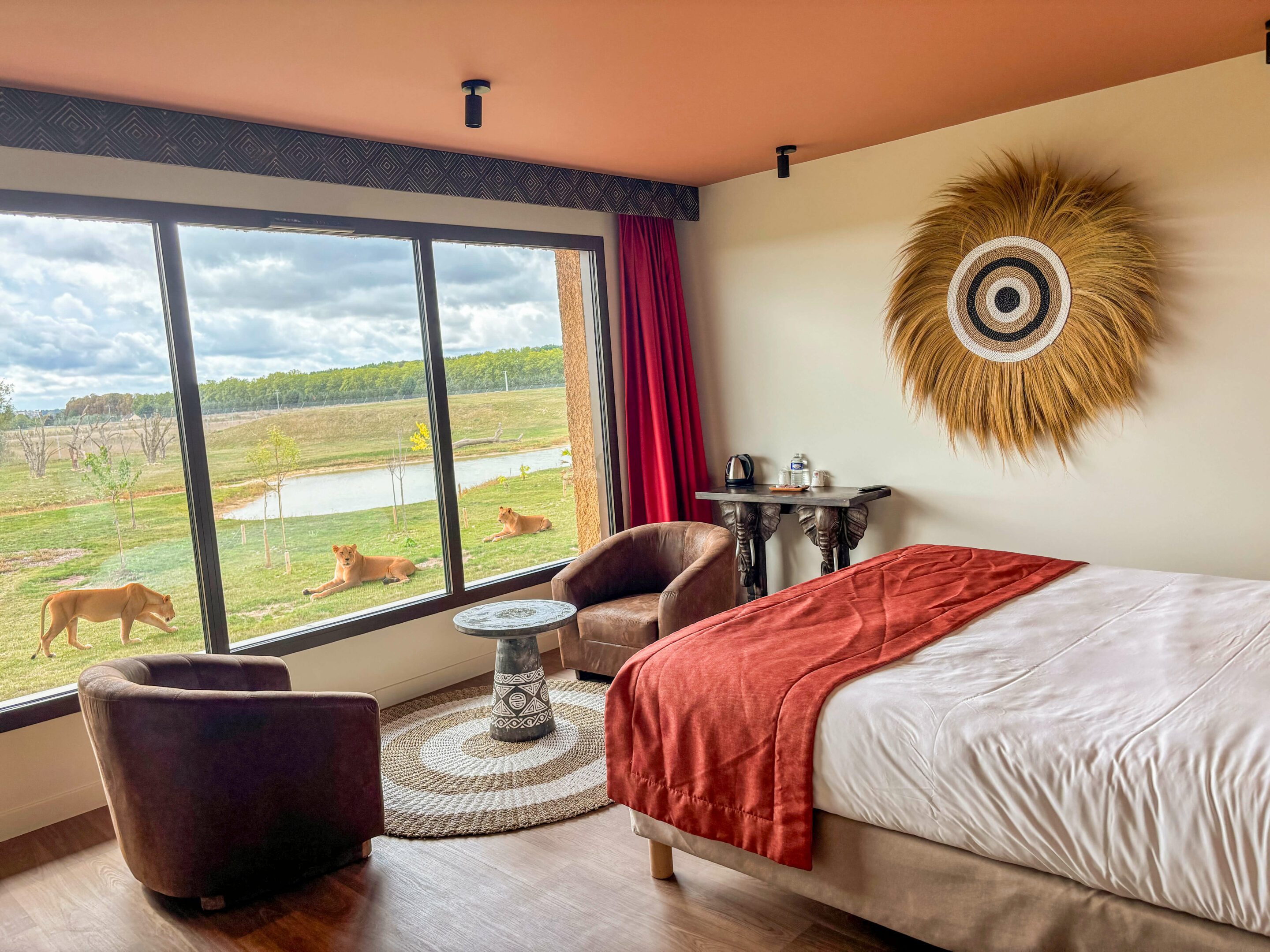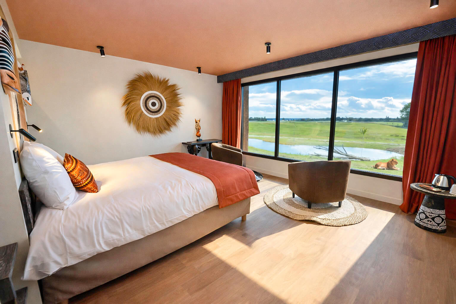 Selon vos envies, vous pouvez laisser les rideaux ouverts pour profiter pleinement de la vue panoramique sur le territoire des lions, ou les fermer pour créer une obscurité totale et savourer un sommeil profond. À chaque moment de la journée, la chambre offre une expérience différente, rythmée par la lumière et la vie du territoire.